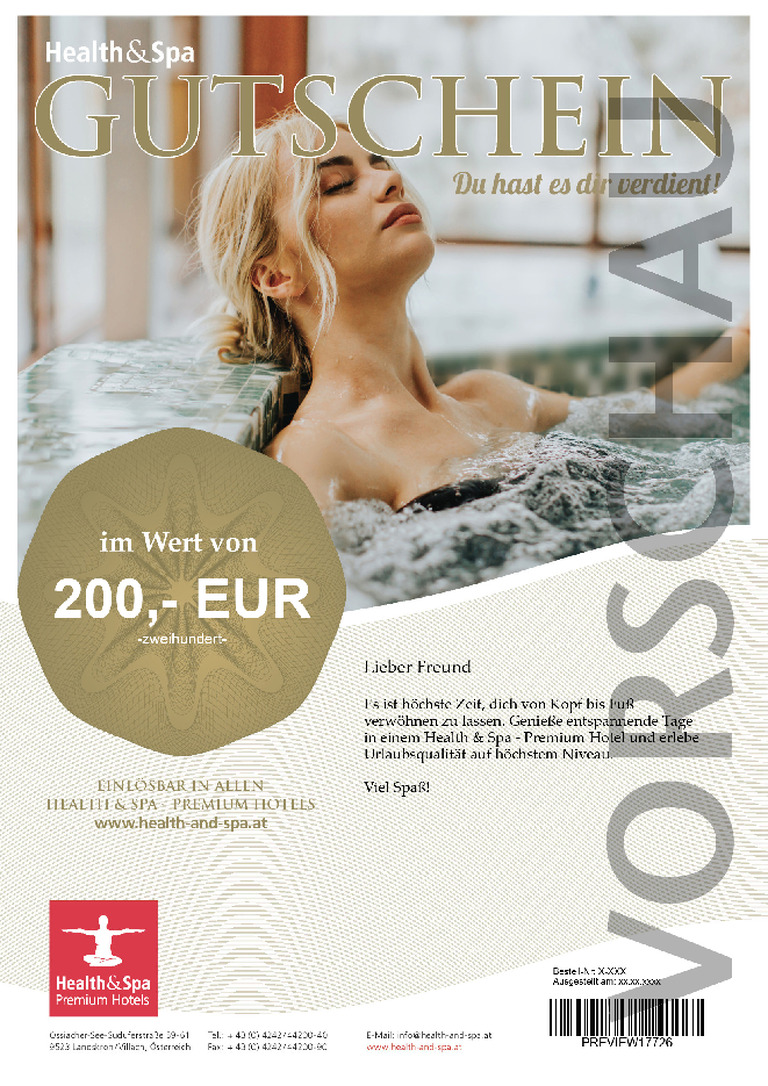 Überraschen Sie Ihre Liebsten, Freunde und Bekannten mit Zeit für sich. Der Wellness-Gutschein der Health and Spa - Premium Hotels ist das ideale Geschenk für Genuss- und Gesundheitsurlauber und kann jederzeit in allen Mitgliedsbetrieben eingelöst werden. Sie selbst bestimmen den Wert, die Beschenkten entscheiden über Hotel, Ort und Urlaubszeit.