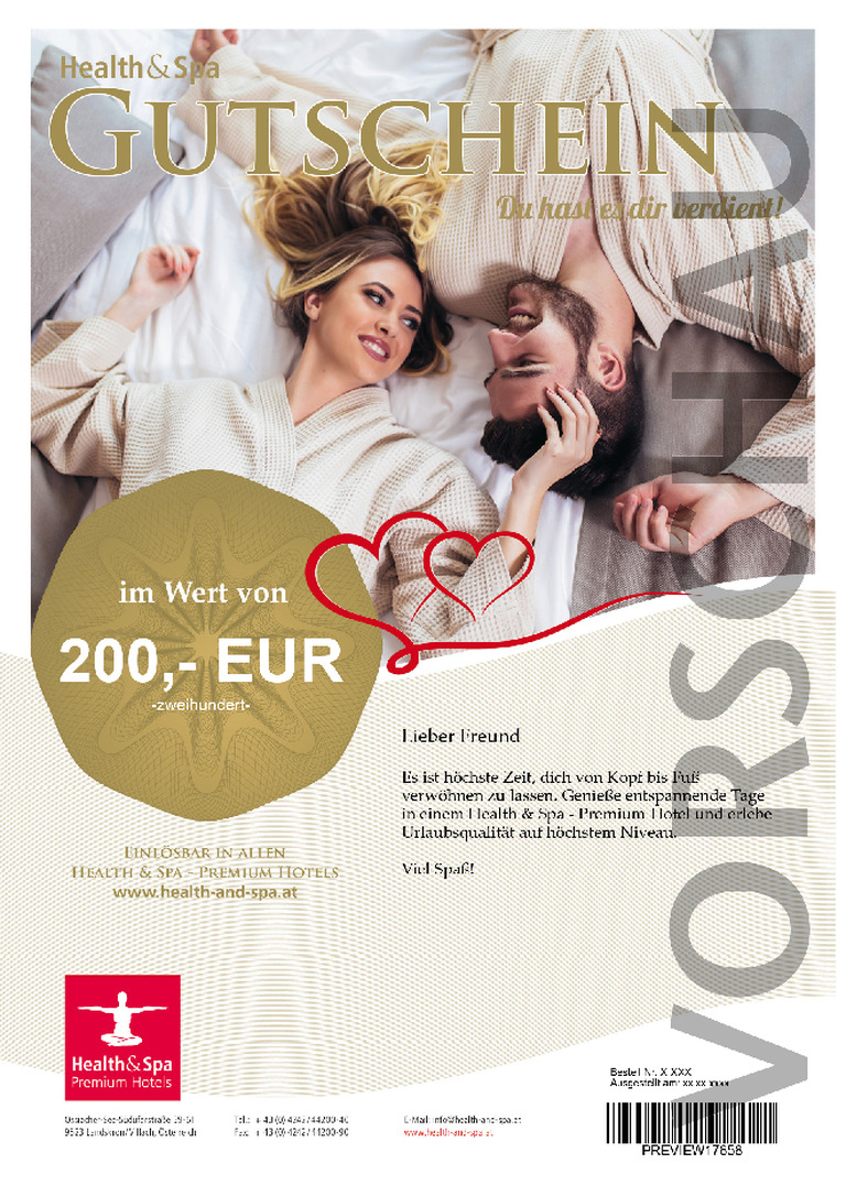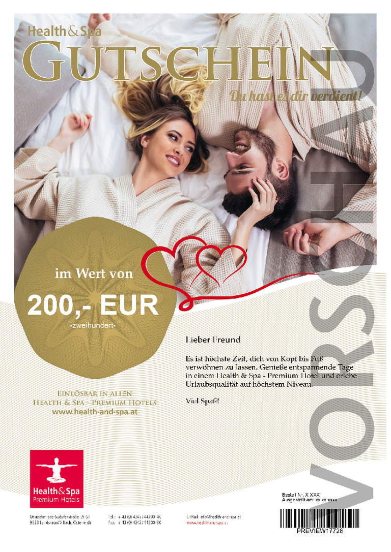 Überraschen Sie Ihre Liebste oder Ihre Liebsten mit einer genussvollen Kuschelauszeit in einem erstklassigen Wellnesshotel und lassen Sie sich gemeinsam mal richtig verwöhnen. Der Wellness-Gutschein der Health and Spa - Premium Hotels ist das ideale, persönliche Geschenk zum Valentinstag und kann jederzeit in allen Mitgliedsbetrieben eingelöst werden. Sie selbst bestimmen den Wert, gemeinsam entscheiden Sie über Hotel, Ort und Urlaubszeit.So schenken Sie Entspannung in nur wenigen Schritten: