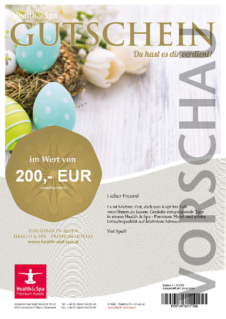 Überraschen Sie Ihre Liebsten, Freunde und Bekannten mit Zeit für sich. Der Wellness-Gutschein der Health and Spa - Premium Hotels ist das ideale Geschenk für Genuss- und Gesundheitsurlauber und kann jederzeit in allen Mitgliedsbetrieben eingelöst werden. Sie selbst bestimmen den Wert, die Beschenkten entscheiden über Hotel, Ort und Urlaubszeit.So schenken Sie Entspannung in nur wenigen Schritten: